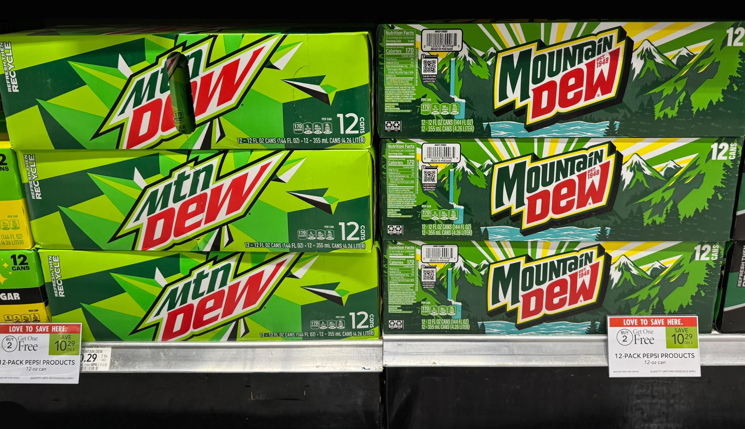 Pepsico’s Mountain Dew has been teasing this re-brand since late 2024 but it’s finally rolling out in-stores. (New packaging on right side of image,)